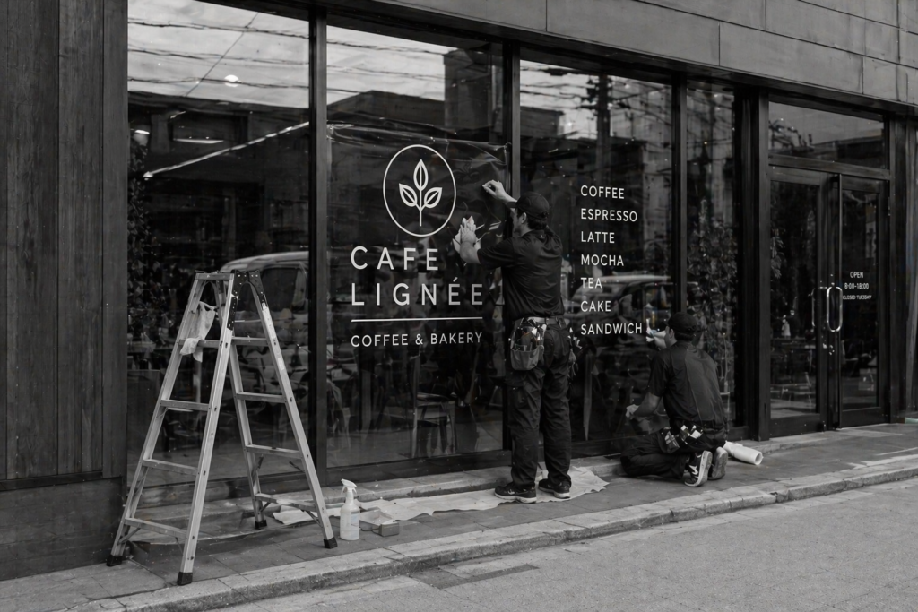比較的コストを抑えて貼り替えができるのが、アルミ複合板を使用したプレート看板や、ガラス面に貼るウィンドウサインです。これらは既存の壁やガラスをそのまま土台として利用できるため、大きな構造工事が必要ありません。