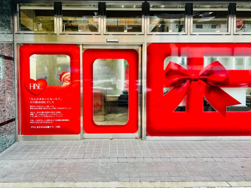 歩行者の視線を一瞬で奪う“赤×リボン”の世界観を、そのままガラス一面に再現しました。