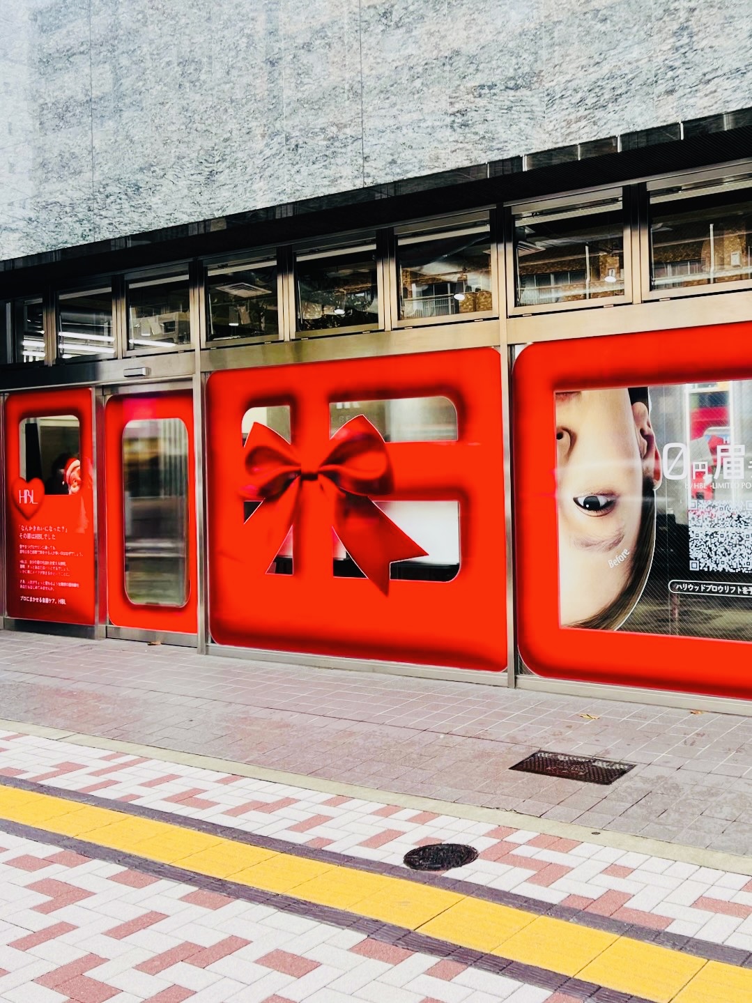 歩行者の視線を一瞬で奪う“赤×リボン”の世界観を、そのままガラス一面に再現しました。